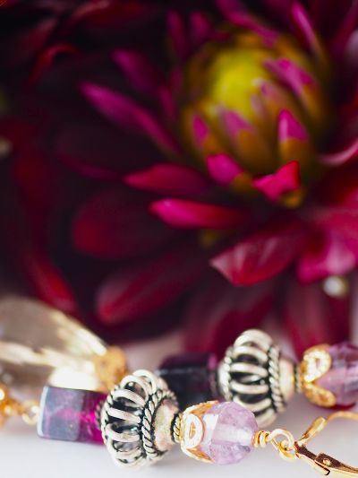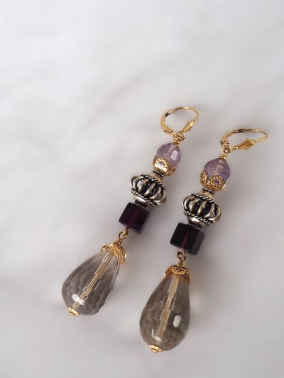 Goldfilled haakjes met amethist, fluoriet en rookkwarts