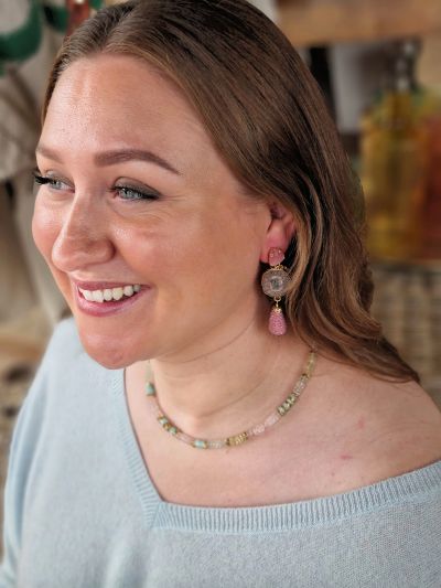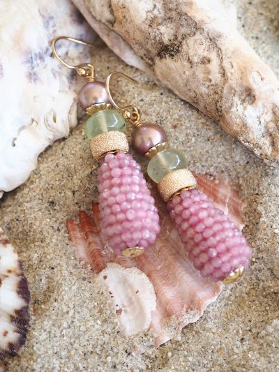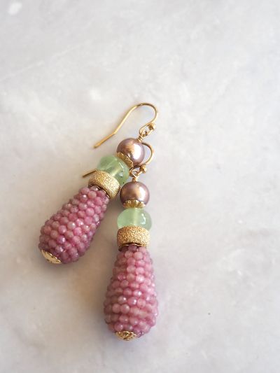 • Goldfilled oorbellen met parel, prehniet en roze toermalijn