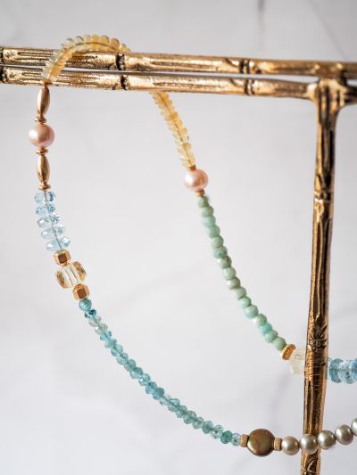 • Goldfilled ketting met maansteen, parel, amazoniet, morganiet, ethiopisch opaal