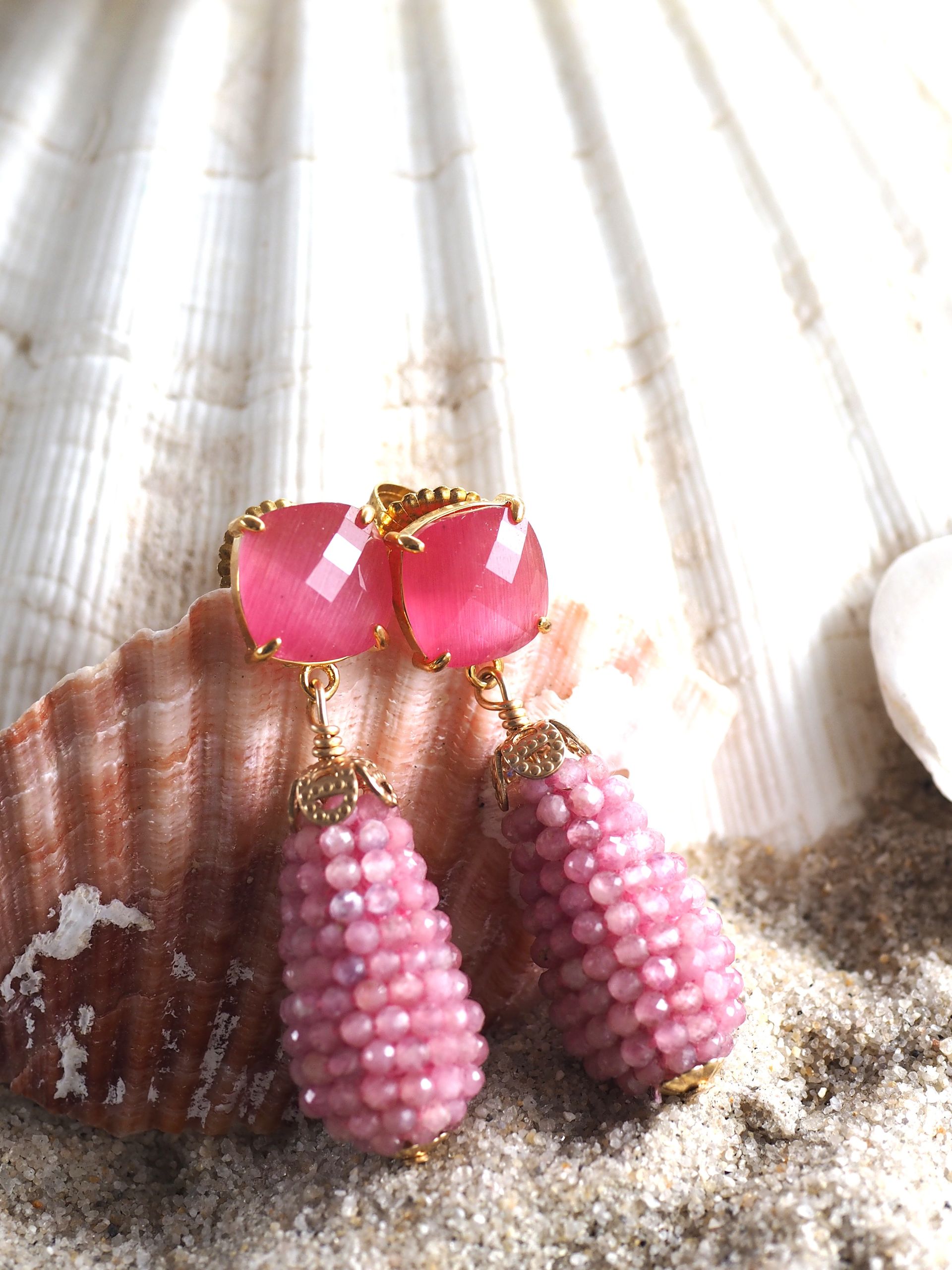 Brass stekers met kwarts en goldfilled oorbellen met roze toermalijn