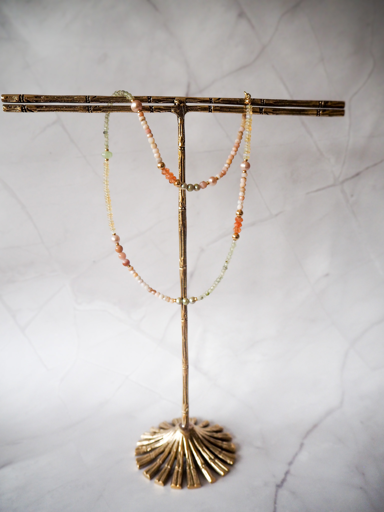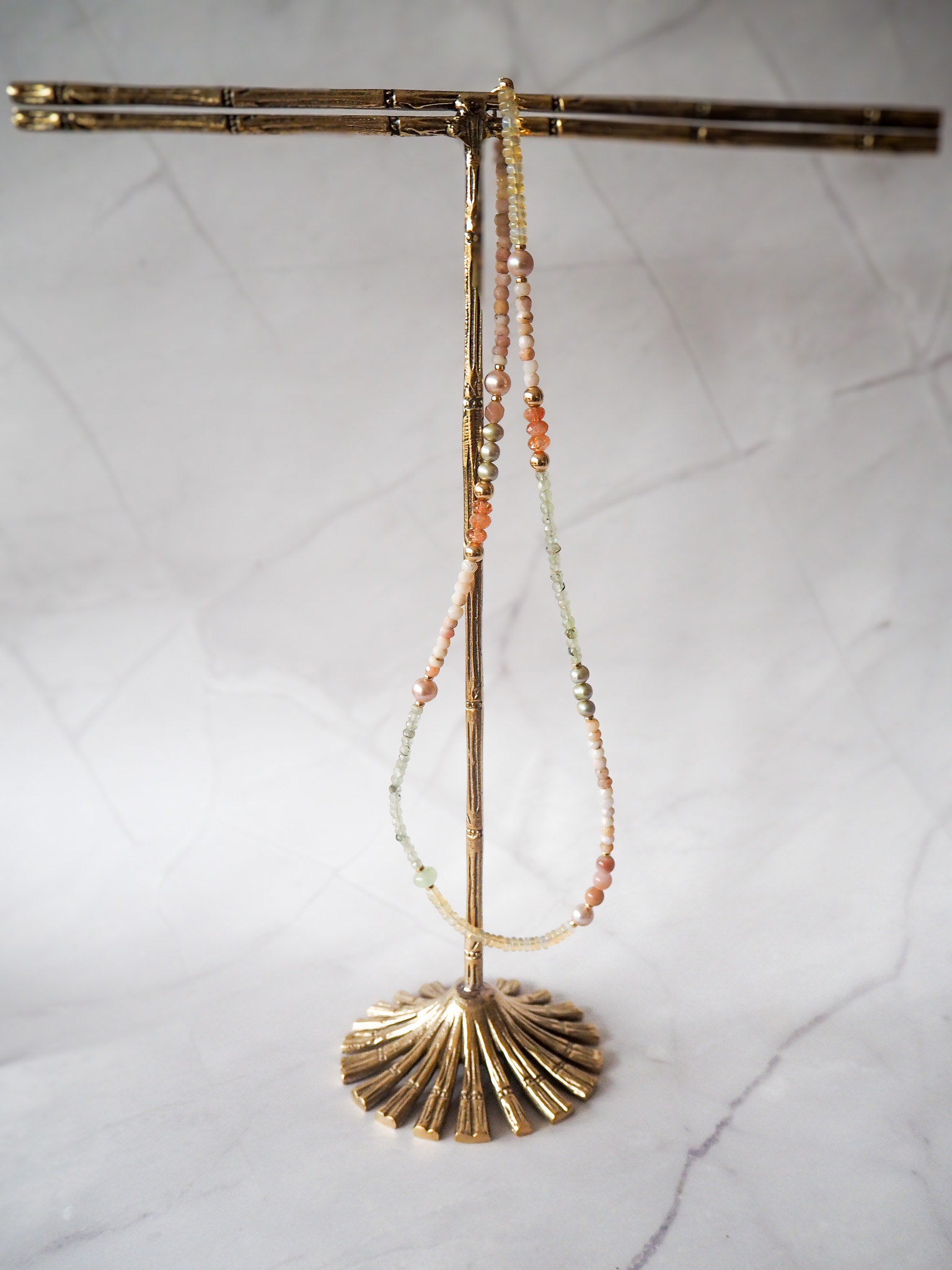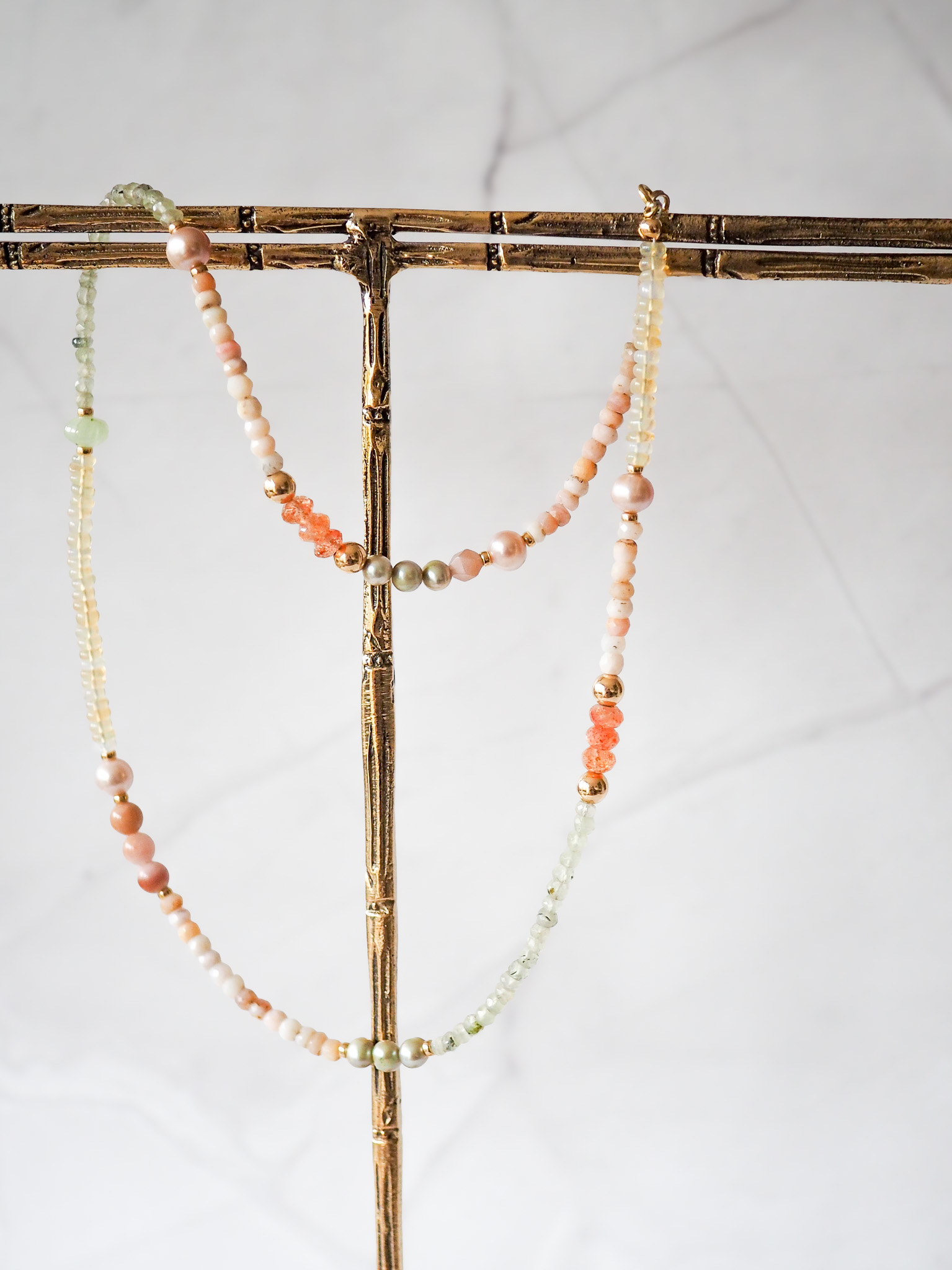 Goldfilled ketting met ethiopisch opaal, maansteen, zonnesteen, parel, prehniet en opaal