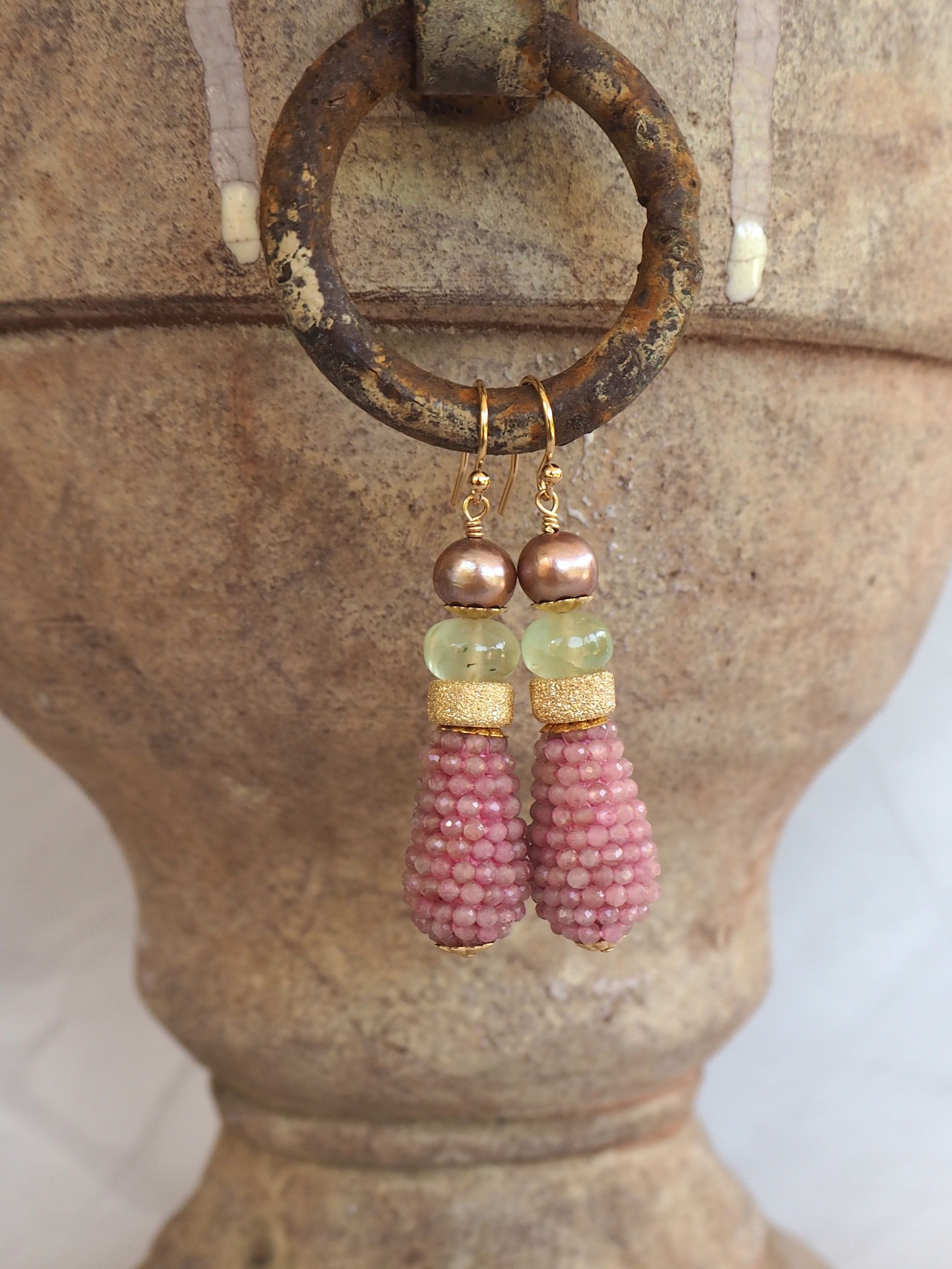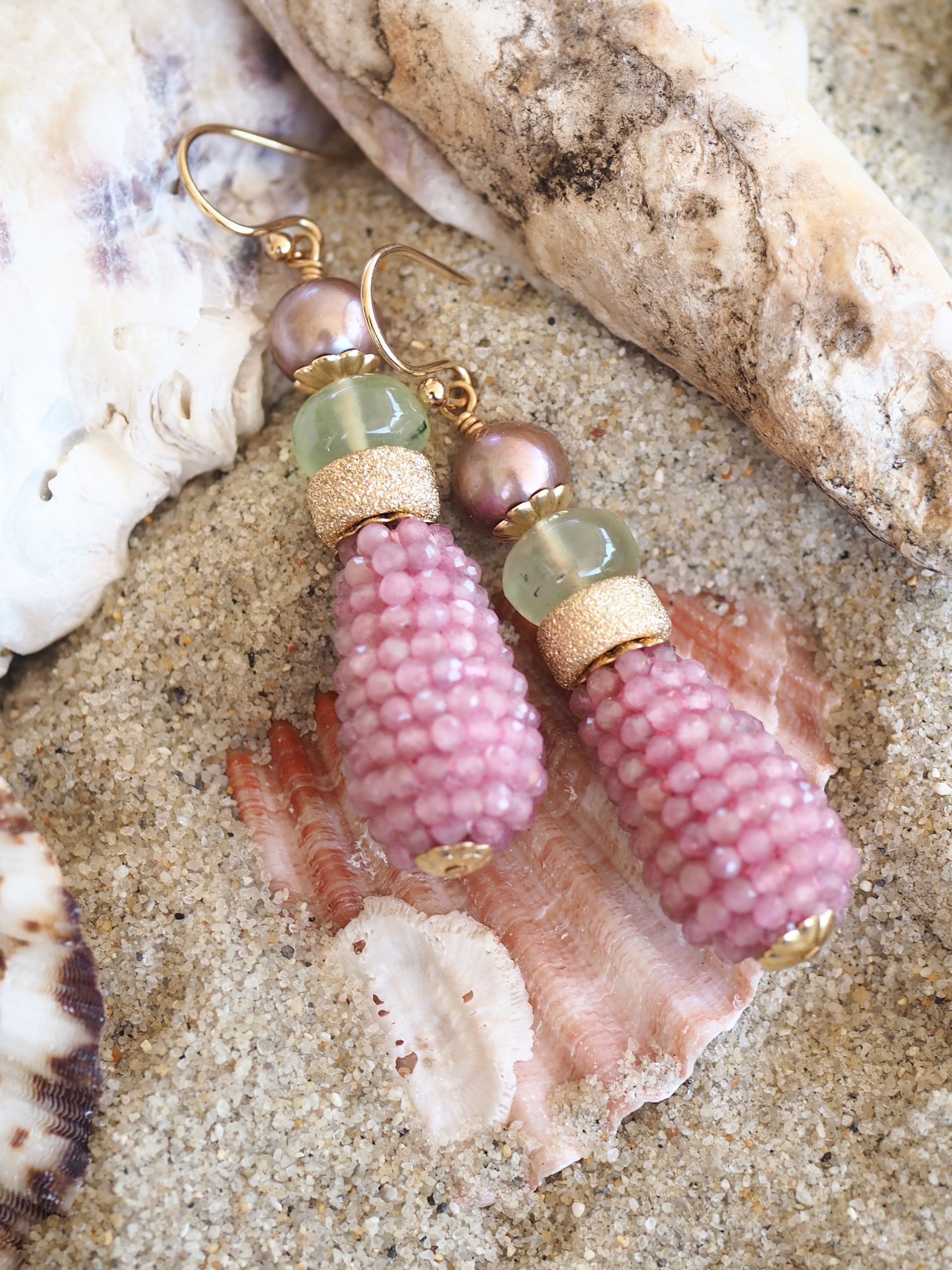 Goldfilled oorbellen met parel, prehniet en roze toermalijn