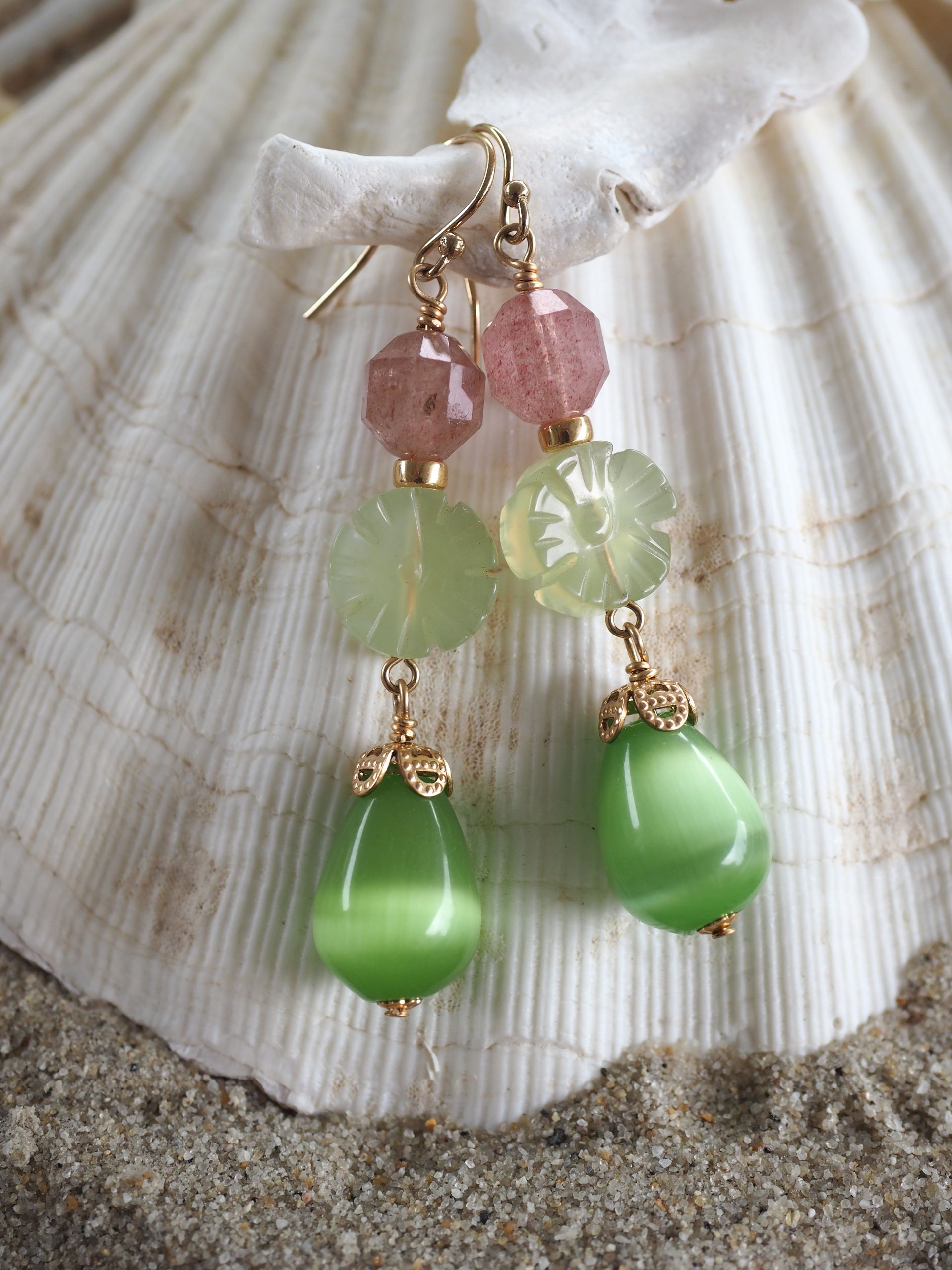 Goldfilled oorbellen met rodochrosiet, jade en kattenoog