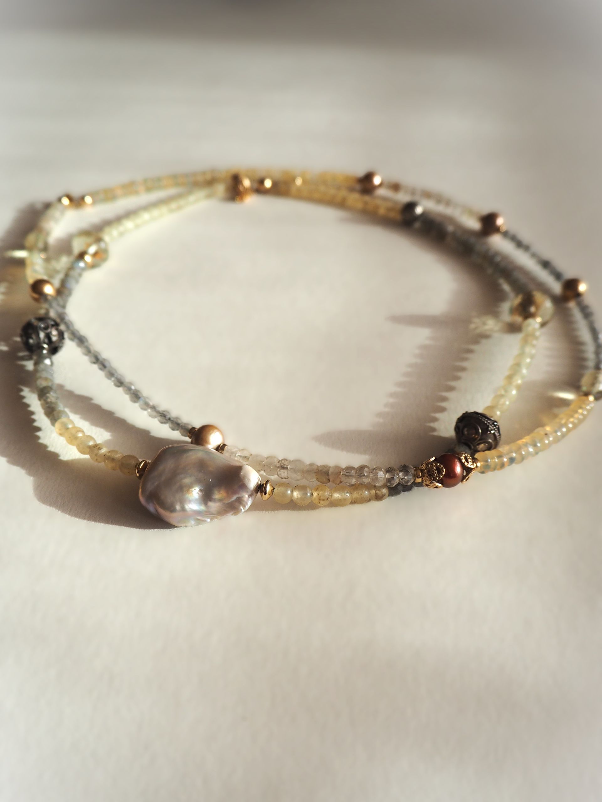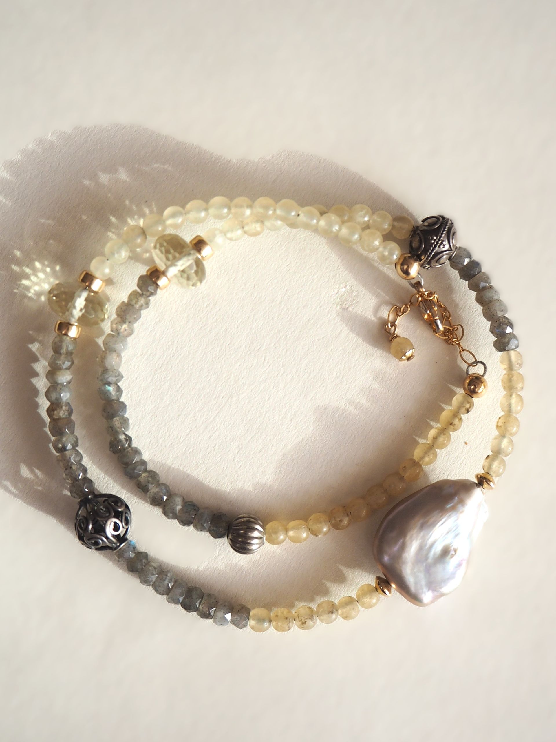 Jewels by Marthje ketting met rutielkwarts, prehniet, parel, prasioliet en labradoriet