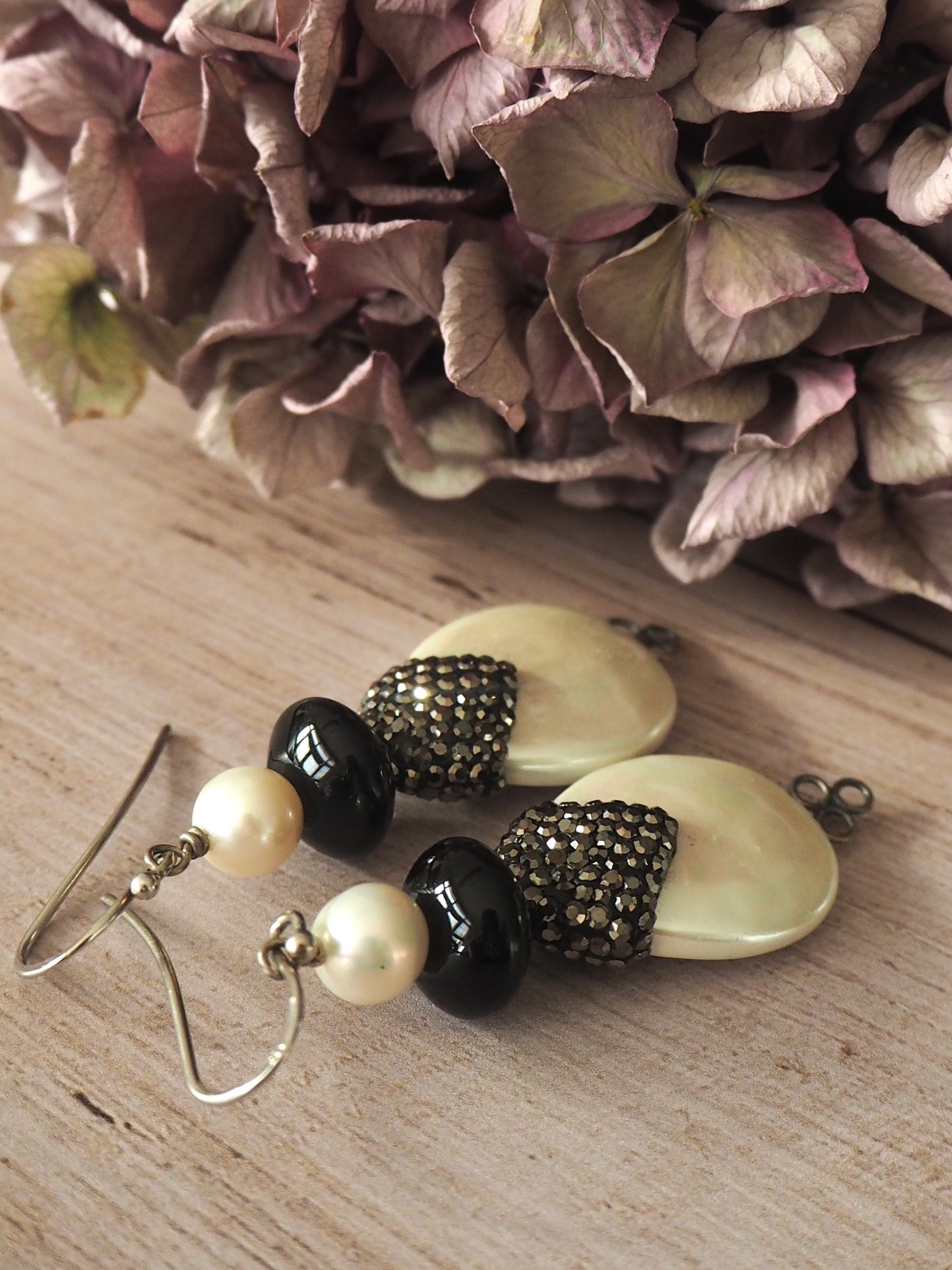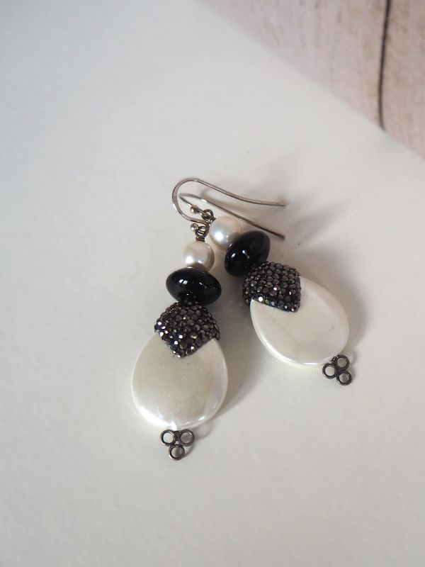 Zilveren hangers met parel, onyx en markasiet